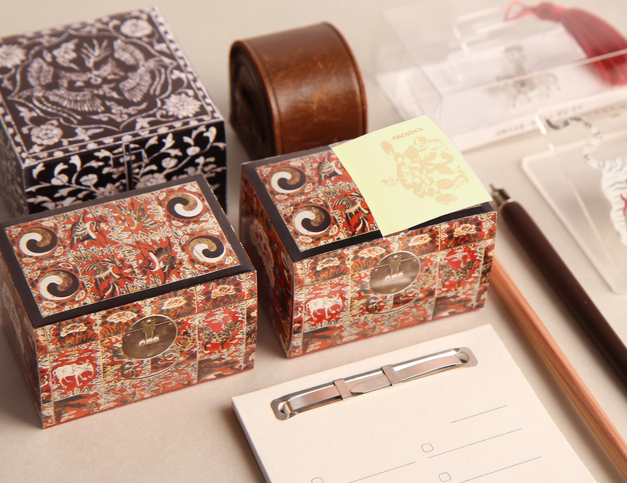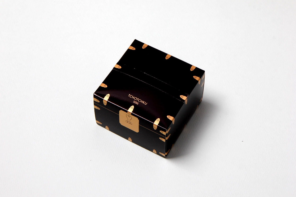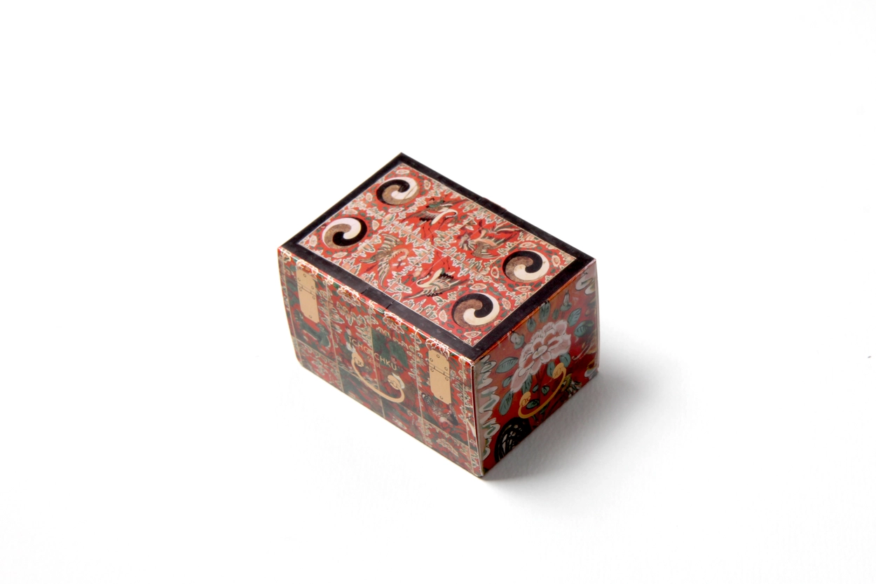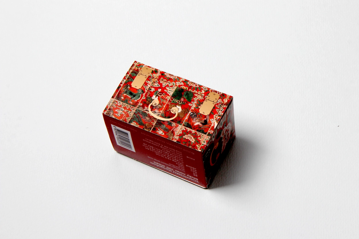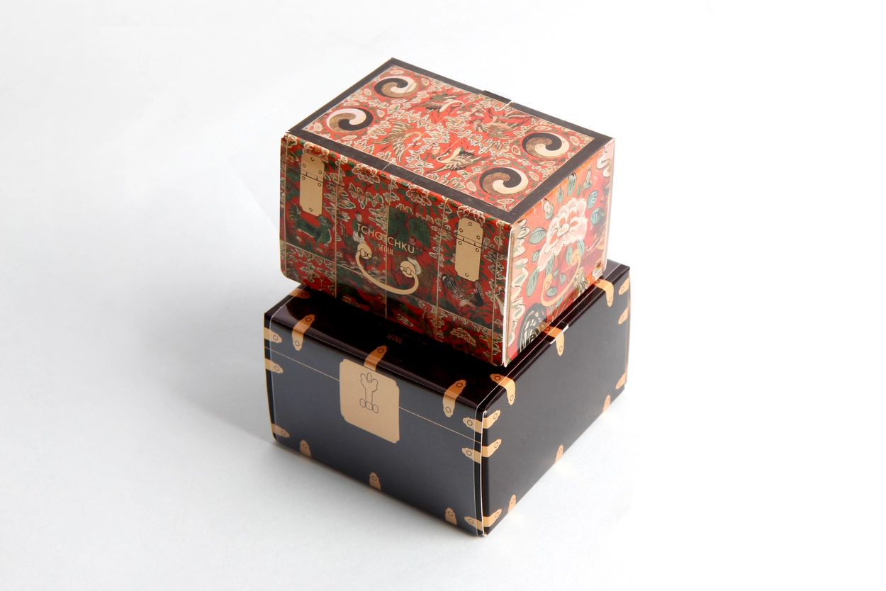 붉은 주칠을 하고 꽃과 태극무늬 동자 등 여러 가지 모티브로 아름답게 제작된 화각함을 활용하여 디자인했습니다.