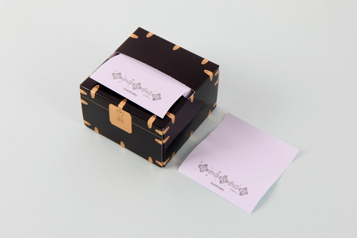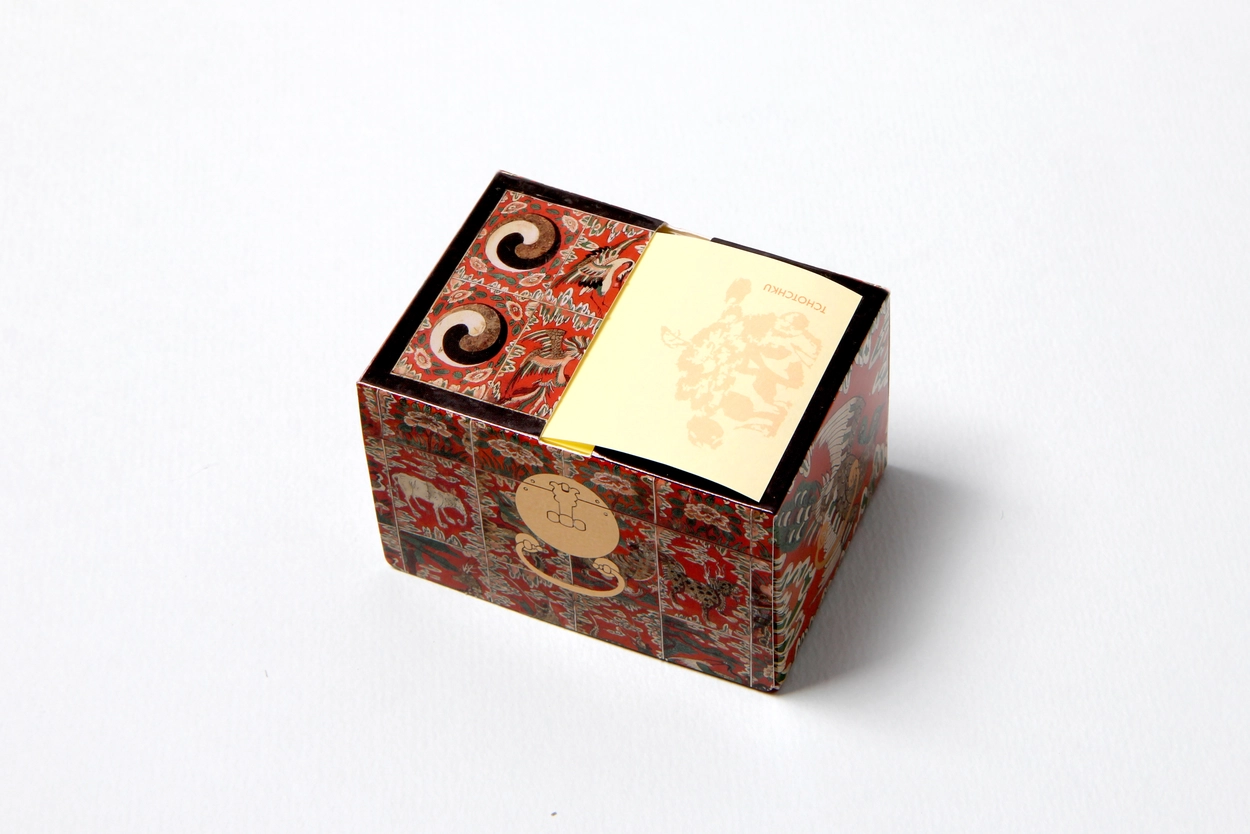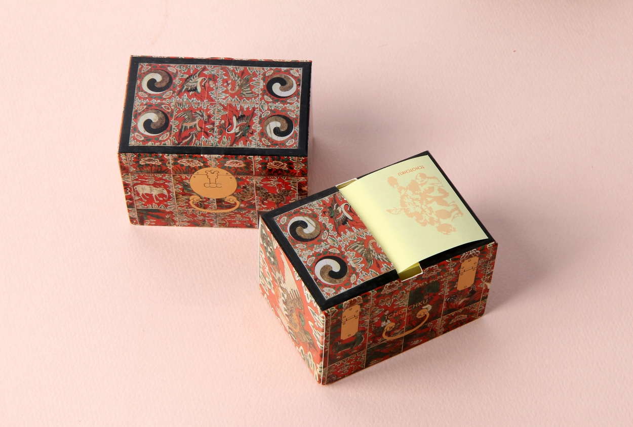 교명 상자 점착메모지는 간편하게 톡톡 뽑아 쓸 수 있는 점착메모지입니다. 왕이 왕세자, 빈 등 책봉을 위한 교명을 내릴 때 교명을 담는 나무 상자와 교명에 들어가는 무늬를 활용하여 디자인했습니다.